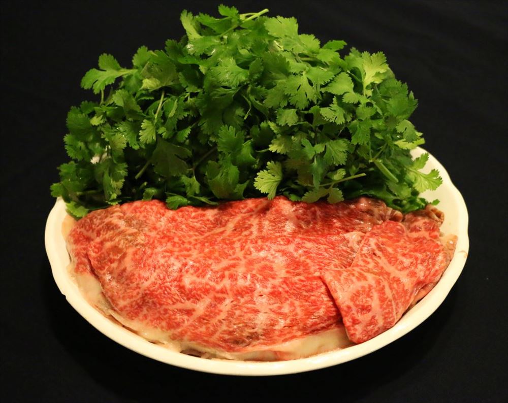 香りの強いパクチーと柔らかく甘い宮古牛の組み合わせ。宮古牛とパクチーのしゃぶしゃぶは相性ぴったりです。