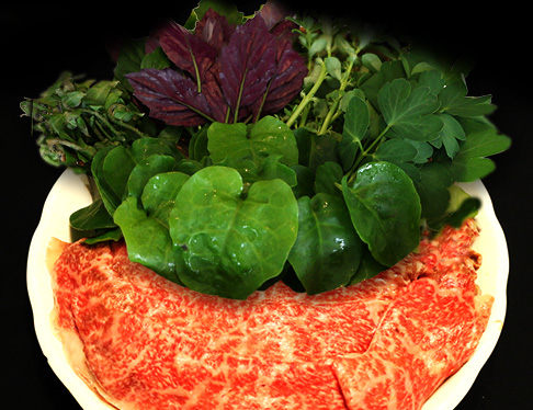 美容と健康に良い、栄養豊富な季節の琉球野菜4種に、島外では手に入らない希少な宮古牛(A4~A5クラス)を付けたしゃぶしゃぶセットです。