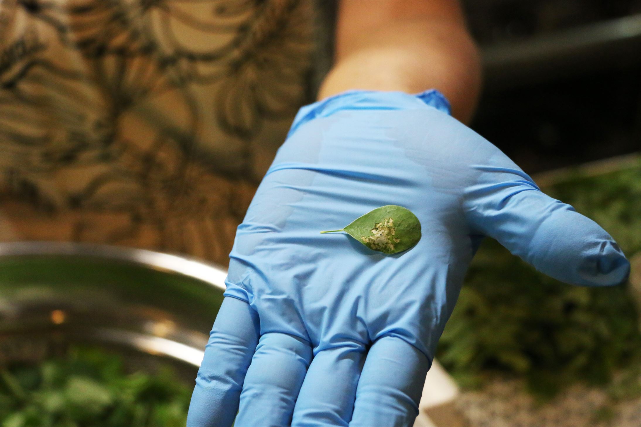 緑の葉っぱ以外のもの(小枝や枯れた葉など)が少しでも入ってしまうと、ザラザラ感のあるモリンガパウダーになってしまうため、同じ材料を、なんと三回も繰り返し選別を行います。