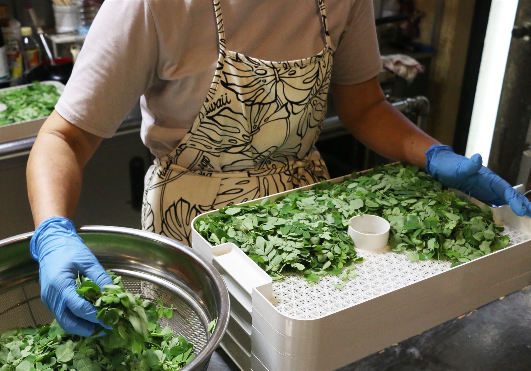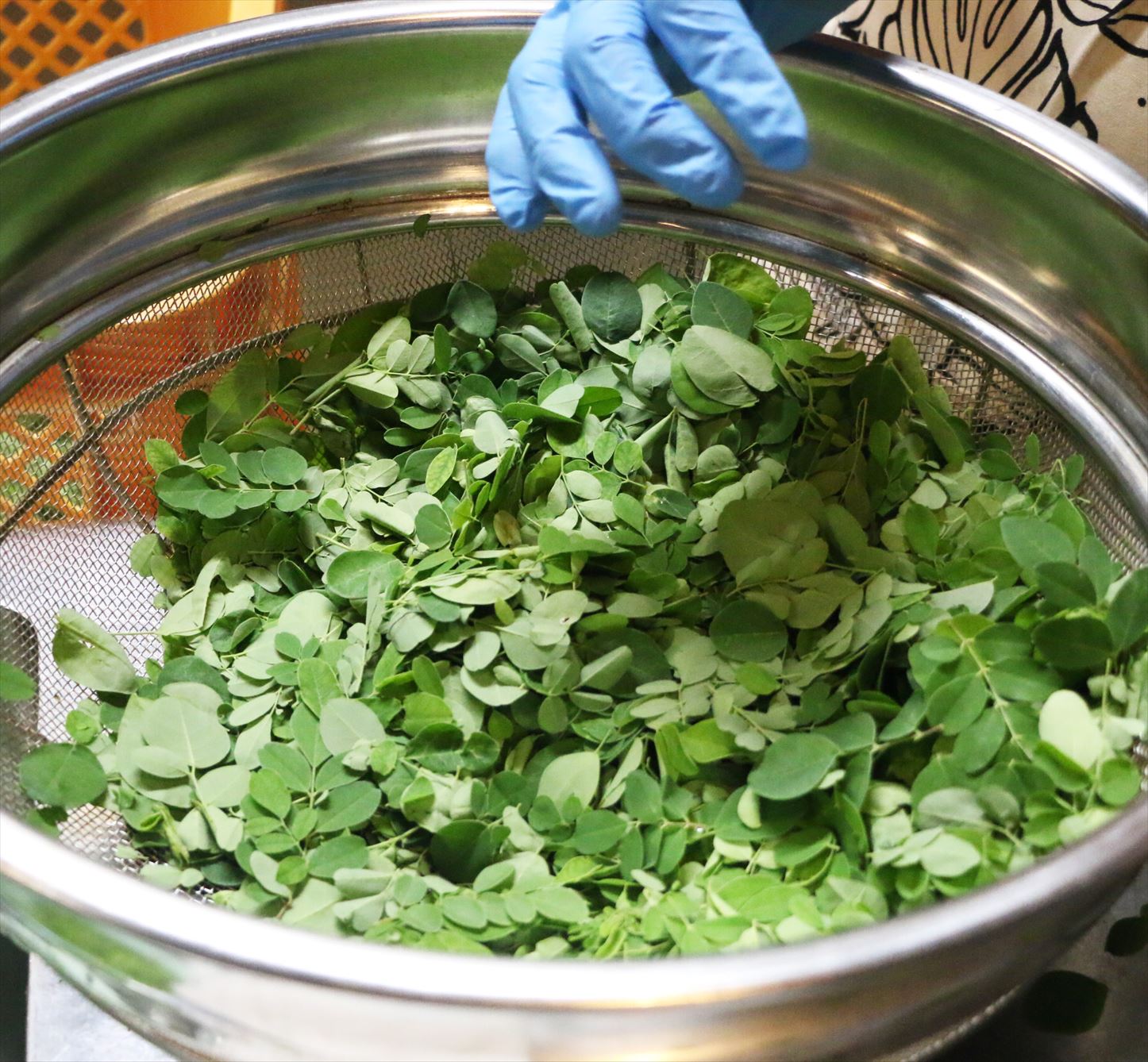 ハーブや野菜は、高温で調理や加工を行うと、栄養素や色素が壊れてしまいます。 その為、高温になりすぎないよう、小まめな温度調整を行いながら低温乾燥することによって、モリンガ本来の豊かな栄養価を保つことが出来ます。
